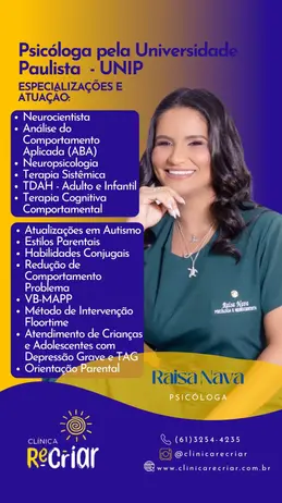 A Clínica Recriar Unidade Águas Claras oferece atendimento psicológico especializado para todas as idades, promovendo saúde mental e bem-estar de crianças, adolescentes, adultos e idosos. Com uma equipe qualificada de psicólogos, focamos no tratamento de ansiedade, depressão, transtornos emocionais e desenvolvimento pessoal. Nosso objetivo é oferecer um espaço acolhedor onde cada paciente recebe um cuidado personalizado para superar desafios e alcançar uma vida equilibrada. A Clínica Recriar Águas Claras é referência em psicologia em Brasília, com um atendimento que respeita a individualidade e promove a qualidade de vida.